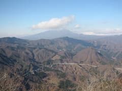 頂上は狭く、まわりは低い灌木で360度の展望。表妙義、裏妙義のほか、白い噴煙を上げる浅間山や荒船山などが見渡せる。ビールと薫卵を手に、周囲の展望を堪能する。