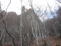 昼食の後は行塚山の下まで戻り、星尾峠へ。あとは下るだけかと思ったが、まだまだ見所が控えていた。田口峠への道を分けると、高岩と立岩の岩峰を見ながら山腹を巻く、表妙義中間道のような感じの道となる。