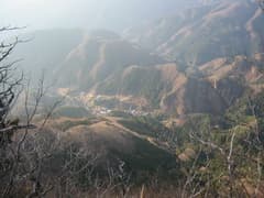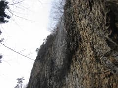 立岩の基部を目指して登ると、林の上にのしかかるように岩峰が聳ち、どこをどう登るのか、ちょっとワクワク。ルンゼ状のガレを登り、岩壁に斜めについたバンドを鎖場で上に出る。意外と広い雑木の尾根だが、横に寄ると大絶壁の上で、山麓の集落が足元だ。