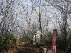 荒船山最高点の行塚山は、台地の上の一突起というイメージがあったが、こちらから登ると意外と登りでがあり、急登で山頂に飛び出す。樹林に囲まれて展望は木の間越しのみだが、雲が上がって、梢の霧氷が綺麗だ。