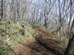 ちょっと急登で荒船山〜黒滝山の稜線に出る。ここからは木の階段があったりして、かつては整備された道のようだが、最近はあまり歩かれていないのか、一部に少し深いササ藪がある。しかし、これで一度、黒滝山まで歩いてみたくなった。