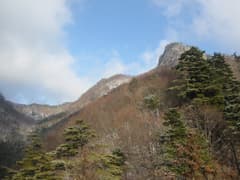 道標に導かれ、山腹を絡んだり、流れを渡ったりして谷を遡る。U字形の結構深い谷だ。谷の上には鋭い岩峰がいくつも見える。杉林の中の小さな造林小屋を過ぎると、谷の奥に毛無岩の大岩壁が現れる。かなり高く見え、迫力だ。