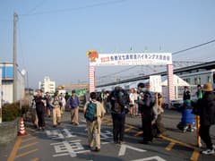 八高線の車内は、リュックを背負い気合いの入ったその筋の人達でほぼ満席。タイムを競うレースじゃないとわかっちゃいるが、気分はほとんどロードレースのスタート前だ。6時24分に小川町に到着。受付で記録カード、コースマップ、参加賞のタオルとポーチを貰って、いざ出発。