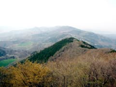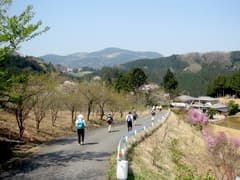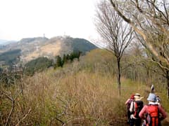 ここからは山を絡んで登る林道歩きが続く。勾配があるので頑張りどころだ。途中から尾根上の山道に入ったときは、固い舗装道から解放されて一息つく。大霧山を望む荻平の山村を抜けると、いよいよ笠山の登りだ。
