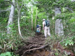 準備をして出発。すぐに沢を渡ると、樹林帯の中のジグザグの登りとなる。他の登山者と前後しながら登って行く。最終水場の標識を見て、高度を上げて行く。周囲の樹林の緑がきれいだ。