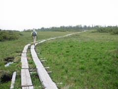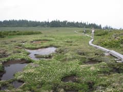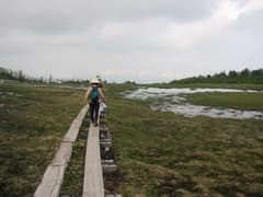 頂上湿原に敷かれた木道を辿って、避難小屋(大師堂)の近くで、湿原を眺めながらパンの昼食をとる。それにしても、開放的な良い眺めだ。帝釈山は往復2時間かかるし、天気が下り坂なので、今回は割愛。湿原をぐるっと一周し、下山にかかる。途中、大粒の雨に遭い、雨具を着けて降りる。しかし、猿倉登山口に着く頃には小降りになっていた。