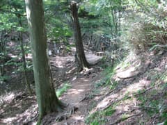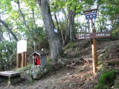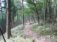 駐車場から三峰神社への道を戻り気味に少し辿り、奥宮参道入口という石標から雲取山へのコースに入る。しばらくは杉とササの中、山腹をトラバースする緩い登りだが、奥宮への道を分けるあたりから少し傾斜が強まり、ジグザクに登ると地蔵峠だ。