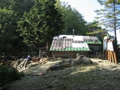 霧藻ヶ峰から一旦大きく下り、鞍部のお清平へ。帰りはこれが登りになる訳で、ちょっといやだ。お清平から白岩山へはところどころ石灰岩の露岩のある急登だ。ひたすらシラビソなどの樹林の中で、展望は乏しい。急登を登りきると前白岩の肩という標識のあるところに出るが、ここから前白岩山(1776m)へさらに10分ほどの急登。ここから下ると(ここも帰りは結構な登りだ)ようやく白岩小屋。やれやれ、ここで一休み。