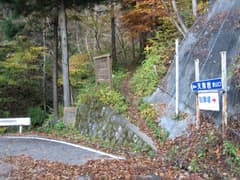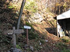 避難小屋(といっても屋根と壁だけのもの)のある奥の二股に到着すると、道が二手に分かれて、どちらにも天狗岩へという道標がある。ここは右のルートに入ってみる。