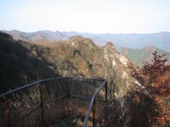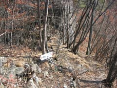 ところどころに岩場のある痩せ尾根で、道は細いが良く踏まれて藪もなく、問題なく歩ける。しかし、最後のピーク(P4)からマルの鞍部へ向かっては痩せた岩稜となり、左側はすっぱり切れ落ちていて高度感があり、慎重に歩く。岩の割れ目を下ると、ようやくスリルある岩稜も終わり。横道コースと合流して鞍部に下る。雑木林に囲まれた広場になっていて、ここまでの緊張がほっと緩む。