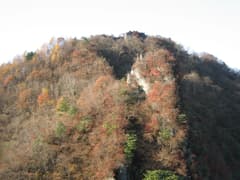 デザートに柿を食べてゆっくりしたのち、烏帽子岳の頂上を後にする。帰りはマルの巻き道を通る。この巻き道の入口はちょっとわかりにくく、木の枝の赤と黄のテープだけが目印だ。落ち葉ふかふかの道で、振り返ると烏帽子岳の頂上が見上げるように高い。