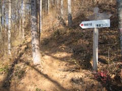 展望台でゆっくりしているうちにご夫婦が一組登ってこられたので、入れ替わりに出発。天狗岩の遊歩道をシラケ山方向に下ると、烏帽子岳を指す新しい道標が現れ、良い道が分岐している。この道を辿るとシラケ山の中腹で二つに分かれ、左へは「烏帽子岳(横道コース)」と書いた新しい道標が指している。ほぼ水平に山腹を巻く道のようだ。右は山腹を斜めに登る道で、ちょっと古い道標がやはり烏帽子岳を指している。横道コースの方にはマジックで「無難」と書き込みがある。帰りは横道コースを通ることにして、行きは右へ進む。