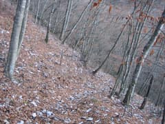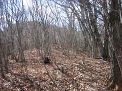 ちょっと寒いが缶ビールを飲んで、ラーメンの昼食とする。寒い割にはのんびり休憩して、頂上を辞す。帰りは往路を戻るが、ルートの様子がわかったので、JPの下りは踏み跡のない尾根上をまっすぐ下る。落ち葉とササの斜面を足任せに下るのは心地よい良い。