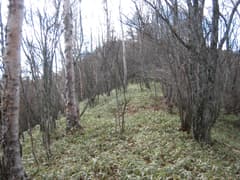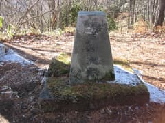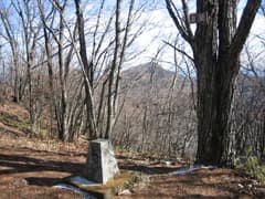東峰を越え、林間のざれた急斜面を下ると、鞍部で左から巻き道を合わせる。鞍部からは最初は緩い登りで、一部スズタケが被って来る区間があるが踏み跡ははっきりしている。やがてササの種類が背の低いミヤコザサに変わって、なかなか快適な道になる。しかし、甘楽・神流・下仁田の三町境界となっているジャンクション・ピーク(JP)直下の登りは少し急で、踏み跡も判然としない。ササの中のそこはかとない踏み跡を辿って、尾根の右斜面(下仁田町側)を絡み気味に登るとピークを行き過ぎてしまったので、最後は半ば強引に斜面を登って(基本的にどこでも歩けてしまう)稜線に出る。JPの1377.5mの四等三角点は少し戻ったところの落ち葉の中にあった。