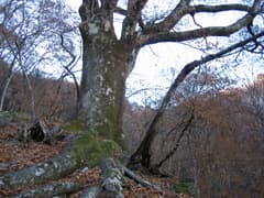 稲含山には登り返さず、手前の鞍部から右へ巻き道に入る。稲含山の急峻な東面を通る点が不安だったが、良い道で問題ない。杉林を通り抜けると、落ち葉がふかふかの自然林のトラバースになる。途中に夫婦(めおと)ケヤキという巨木がある。説明板によると推定樹齢500年、根元周囲約10mで、かんら銘木十選のひとつとのこと。