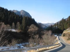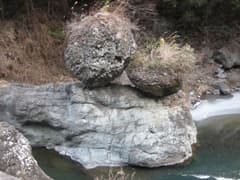 下仁田ICからR254を車で西進、本宿で右折して矢川川沿いに御場山(おんばやま)登山口の高立を目指す。初めて入る矢川川の流域も西上州らしい岩壁、岩峰の多い景観が続く。途中の川の中には夫婦岩と呼ばれる奇岩があり、道路から眺められる。大水によって運ばれて来たのか、浸食によるものなのか、実に成り立ちが不思議な岩だ。