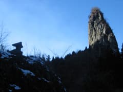 御場山に登る前に、高立の一本岩を見に行く。緑地に白字の「高立」のプレートが付いたカーブミラーがあるT字路を右に進むとすぐに再びT字路になる。ここには「←ハイキングコース、矢川峠・神津牧場」という道標があり、左へ。雪の積もった林道を車で上がる。ちょっと凹凸が多い道で車が心配になるが、無事、一本岩の前の小さな広場に到着。谷の真ん中にこのような岩峰がおっ立っているとは、これまた成り立ちが不思議な岩だ。
