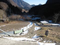 御場山の登山口は少し分かりにくい。最初のT字路を左に行くと、すぐに左に分岐して畑の中を下る道があり、入口には消えかけて「……山、………入口」としか読めない道標がある。この道を下り、民家の前を通って丸木橋で川を渡る。川は大部分凍結していた。