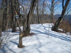 沢を詰めてコルに上がると、反対側すぐ下には林道が通っている。コルから稜線を登る。途中で振り返ると木の間越しに物見山、その中腹に雪原となった神津牧場が見えた。最後は樹林の中の登りとなり、御場山の山頂に到着。