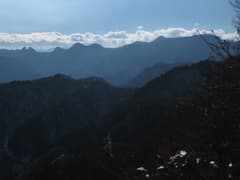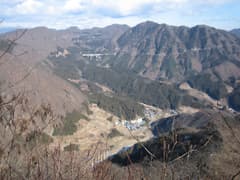 頂上から北に進んだ次のピークも眺めが良く、荒船山の右に兜岩山まで見えた。さらに北に進むと、御場山の北面の断崖の上に出て、木の間に高立辺りの集落が見下ろせる。ただし雑木林に覆われて広い展望はないので、御場山山頂まででも十分だろう。居心地も頂上が小広くて一番なので、頂上に戻り、大展望と鯖の照り焼き缶を肴に缶ビール、そして餅スープの昼食にする。