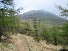 上々の天気で、西篭ノ登山から東篭ノ登山にかけての吊り尾根が青空に浮かぶ。まずは東篭ノ登山を目指して出発。登山道に入り、カラマツの自然林の中をゆるゆると登る。冬の間の風雪が厳しいからだからだろうか、枝振りが真っすぐでないところが普通の植林されたカラマツ林と違っている。