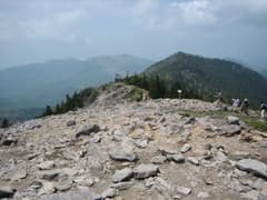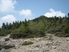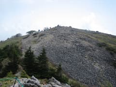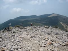 徐々に傾斜が強まり、樹高が低い木々の中の岩がガラガラした道を登ると東篭ノ登山の山頂に到着。周囲は360度の展望だ。登って来た方向を振り返ると丸い池ノ平湿原が俯瞰できる。西篭ノ登山の方を見ると、山頂には沢山のハイカーさんがいるようだ。その奥に湯ノ丸山や烏帽子岳がゆったりと稜線を広げている。