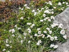 西篭ノ登山へ稜線に入るとシャクナゲの木が多いが、花はまだまだ。下り切った鞍部は砂礫地となっていて、小さな白い花がたくさん咲いていた。名前はなんというのだろう?