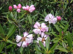 鞍部からの登りの途中での林間では、ヒメイチゲがぽつりぽつり咲いているのを見る。岩がゴロゴロした急な道を上がると、西篭ノ登山の頂上だ。ここだけ日当りがいいからか、ようやく咲いているシャクナゲに行き当たった。