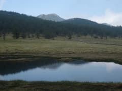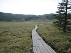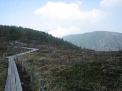 往路を池ノ平駐車場まで戻って、荷物を車の中に入れ、空身で池ノ平に散歩に出かける。花はほとんどなくて、ショウジョウバカマ?をわずかに見たくらいだが、広々とした草原はやはり気持ちがいい。一周する木道があるので、これを辿る。一番奥には鏡池があり、水面に東篭ノ登山を映していた。
