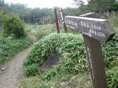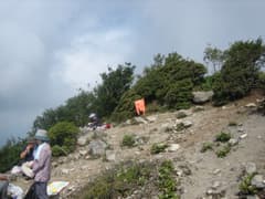猫岩の標識を見て、岩がゴロゴロの道をひたすら登る。途中、傾斜が緩んだところで一休みして、ナシを食べる。ここから再びゴロゴロの急登を登ると頂上の稜線に出た。左に行くと毎度お馴染みの黒檜山山頂で、数パーティのハイカーさんが休憩していた。今日は山頂は素通りして、稜線上のササの中の踏み跡を北に辿る。