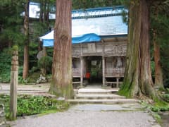 途中でまず、見玉(みだま)不動尊に立ち寄る。R405沿いに「見玉不動尊」の大きな案内看板と駐車場がある。数軒のお土産屋さんの前を通り、立派な山門をくぐって奥の石段を登り、本堂にお参りする。鬱蒼とした杉林に囲まれた石段の傍には水量がとても多い澄んだ流れが落ちている。この水で紙を濡らし、山門の阿吽の仁王像の、身体の悪い箇所と同じ所に投げて貼り付けると治るそうだ。