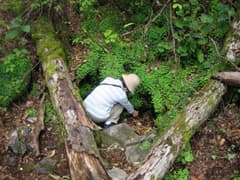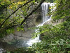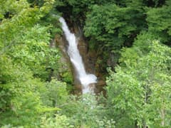 カヤの平から車で切明温泉で戻る途中、雑魚川本流にかかる大滝に立ち寄る。林道脇に駐車して、デジカメだけを持って登山道に入る。少し下ると、信濃路自然歩道(奥志賀渓谷コース)の雑魚川取入〜清水小屋入口の中間に出る。ここから下流に向かうと、支流の沢を渡り(橋がないので増水時は通過できない)、しばらく歩いて大滝への下り口に着く。なお、この先の渓谷沿いの道は倒木が多く、どうも荒れているようだ。少し下ると、大滝が見える場所に着く。水量が多く釜も深くてなかなか豪壮な滝だ。