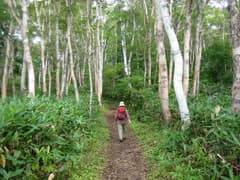 駐車場に車を置き、北ドブ湿原と八剣山を目指して出発。カヤの平高原ロッヂの横を通って、ダケカンバ林やブナ林の中を緩〜く登って行く。西コースと東コースがあるが、距離・時間ともほとんど変わらない。今回はいつの間にか西コースを登っていた。