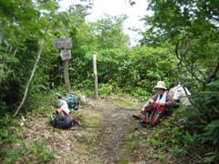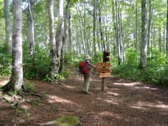 湿原の奥から湿った道を登って行くと、再び西コースと合流。ここから八剣山へはブナ林の中のちょっと急な登りだが、長くはない。最後は緩い道を辿ると、ササの切り開きの中の八剣山の頂上に到着。展望がないとは聞いてはいたが、木の間から周囲の山が見えることさえも全くない。腰を下ろす場所も5人くらいでいっぱいになりそうで、あまり休憩には向かないが、まあ、それはさておいて、パンとナシで昼食にする。