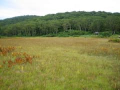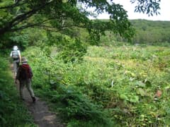 西コースと東コースは途中で合流するので、その先は北ドブ湿原を通る東コースを歩く。緩く下って行くと、森が開けて北ドブ湿原の一角に出た。