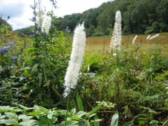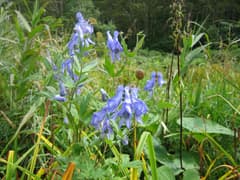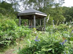 湿原の入口には「8月〜9月にみられるお花」という説明板があり、湿原の周辺に咲いているのがヤマトリカブトやサラシナショウマであることがわかった。湿原の中は草紅葉だが、その中に咲いている黄色い花はミズギクらしい。湿原を木道で横断すると対岸に東屋があったので、ここで一休み。