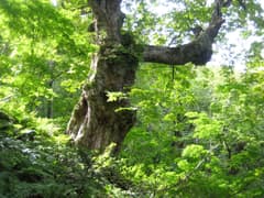気温も上がってきた上に、結構登りがあり、一汗かいたところで、周囲に柵が設置されたひと際大きなトチノキに到着。これが見倉の大栃で、太い幹から横に張り出した枝もがっしりとして、見事な枝振りだ。往路を戻り、もう一度、風穴に立ち寄って、冷風で汗を冷やした。