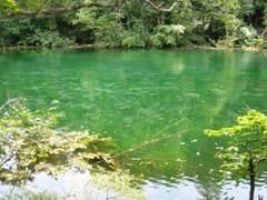 秋山郷からの帰り道の途中で、次の見所の竜ヶ窪に向かう。竜ヶ窪は信濃川の河岸段丘の上の湧水池だ。駐車場に車を置いて奥へ少し歩くと、杉林に囲まれた池に出る。池のほとりの神社には泉があり、大きな容器に水を汲む人が多い。池に沿って奥へ歩くと、ここにも社があり、その後ろの崖からは冷たい水がこんこんと湧き出していた。