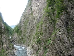 清津峡沿いの歩道は、かつて落石事故があったために閉鎖され、代わりにトンネルで探訪できる(500円)。トンネルの途中の4カ所から、渓谷の壮大な柱状節理の岩壁を見ることができる。