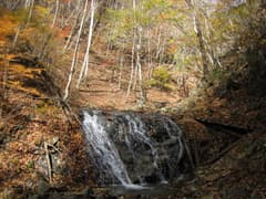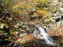 準備を整えて出発。登山口の道標には南天山まで3.2kmとある。鎌倉沢に沿った道は、最初は右岸の山林を高巻くが、すぐに沢に降りると、木橋で水流を左右に渡り返しながらの楽しい遊歩道となる。沢は小さなナメや小滝を連ね、紅葉に囲まれ、仰ぎ見ると青空に白い雲が流れて行く。うーん、いい気分だ。