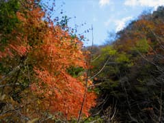 桐生を車で発って秩父を経由し、湛水が始まっている滝沢ダムを過ぎてR140から分岐し、トンネルの多い新しい道で中津峡を上流に向かう。紅葉の名所なので、カメラを構えた見物の人や路上駐車が多い。しかし、紅葉もピークを少し過ぎたせいか、思った程の混雑はなかった。それにしても断崖絶壁を連ねた渓谷美と紅葉は、やはり見事だ。