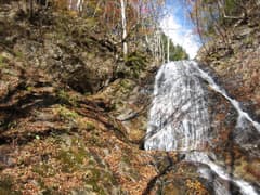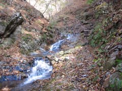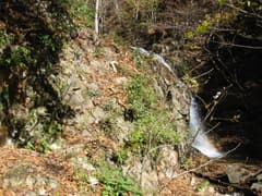ちょっとした沢登り気分を味わいながら歩いて行く。小さな滝が現れ、左から鎖で越える。といっても、鎖がなくても登れるほどの所で無問題。この小滝を越えるとすぐにナメを滑るように流れ落ちる優美な方円滝が現われる。ちょうど、団体さんが滝を左から高巻いて越えているところだった。しばし休憩して、ゆっくり滝を鑑賞する。