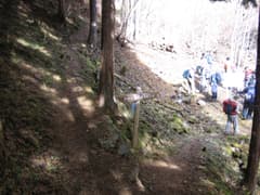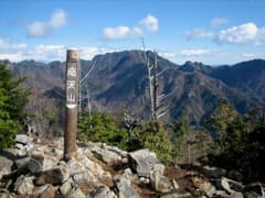 展望を楽しんでいると団体さんが到着し、頂上は満員に。どうも「彩の国ふれあいの森」のガイドツアー?のようだ。引率のガイドさんは周辺の山々に詳しいようなので、双子の円錐峰の名前を尋ねると、左のピークが宗四郎山(1510m)と教えて頂いた。また、南天山もかつて山火事に遭い、谷底まで焼けたそうだ。