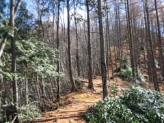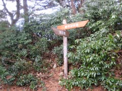 登り詰めて稜線に出る。常緑の木が多い(何だろう)。稜線を右に行くと南天山。左にも稜線上に踏み跡があるが、そちらへの入口には「この先行き止り」の看板があった。