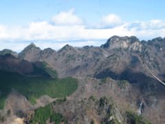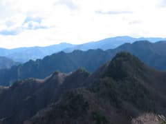 ここからの展望でまず目に入るのは両神山から赤岩尾根にかけての稜線で、バリカンの歯のようなギザギザのスカイラインが望まれる。中でも赤岩岳の大岩壁はひときわ目立つ。