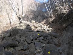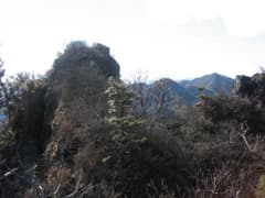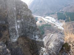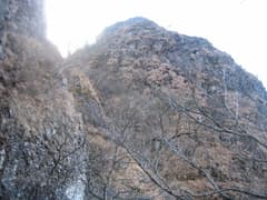 センター跡地の裏手の杉林を登ると、恩賀登山口からの道を合わせ(道標有り)、大岩の下に祀られた御岳大権現の朽ちた祠を見る。この先の岩の上にも周光霊神と刻まれた石碑があり、宗教的雰囲気がする。杉の木立を通して雄岳の岩峰が頭上に聳えているのが見える。杉林を抜け、すっかり葉の落ちた雑木林の急な斜面を登ると、雄岳と雌岳の威圧的な岩壁に囲まれたガレた涸れ沢の登りになる。小さなルンゼにしみ出した水が凍って黒く光っている。風がすごく冷たい。