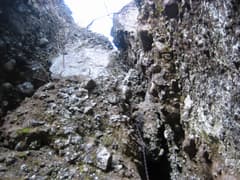 岩壁を回り込むと、鎖の下がった暗いチムニーが現われる。「群馬300山」で「妙義山系に数多い鎖場の中でも上級」と記述されている難所の始まりだ。下から全貌は見えない。最初、いきなり垂直な鎖の登りだが、すぐ上にテラスがあり一息入れる。次は斜めになった岩の裂け目を鎖を頼りに登る。素手で摑む鎖が冷たい。その上のテラスで手を擦り、息を吹きかけて温める。最後の垂直な鎖のチムニーが難物だ。最初はバックアンドニーで登ろうとしたが、チムニーが狭く、ザックが邪魔だ。デジカメだけをポケットに入れて、テラスにザックをデポする。ここが登れるのか、ちょっと弱気になって来る。振り返ると両側を岩壁に囲まれた狭い視界の中に雌岳のピークが日を浴びて明るく聳えている。気を落ち着けて再びトライ。チムニーの奥に入らず、むしろ外に近いスタンスを使って登る。そして、なんとか鎖場の上に這い出た。
