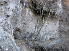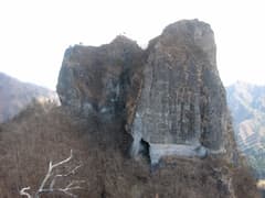 鞍部へはわずかな時間で登り付き、寒いので休まずに右の雄岳に向かう。雑木林の斜面を登ると雄岳の岩峰の基部に到着。見上げると雄岳のピークは圧倒的に高い岩壁の上だ。これに上がるのかー。基部で分岐した道は右へ行く。岩壁を穿つようなトラバース道の途中で、滝壺のように抉れた段差がある。上を見ると氷柱が下がっており、そこから垂れた雫が下で氷となって盛り上がっている。また、岩壁には不動尊と刻まれた石碑が掲げられている。氷で滑らないように注意して通過する。