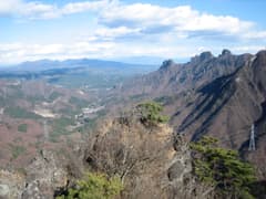 雌岳へは雑木林の急斜面を登る。最初のピークは簡単に登れるが、足元は切れ落ちている。振り返ると、雄岳の岩峰が大きい。どちらから見てもすごい岩壁だ。