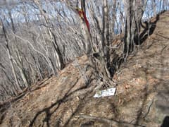コルから雄岳主峰へは、数mの距離だが、スラブに土がへばりついたような嫌な急登がある。岩には染み出た水が薄く凍っていて、土の部分は霜柱。ここの凍結が広がるとかなり危なそう。か細い木の根を摑んで、バランスをとってそっと登る。